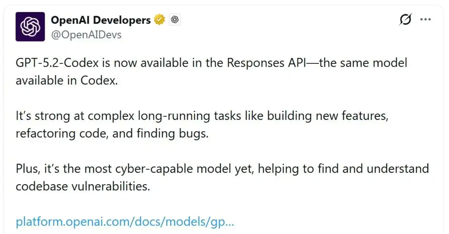 1 月 15 日,OpenAI 在 X 平台发布推文,宣布通过 Responses API 方式,向开发者开放其最强代码模型 GPT-5.2-Codex。
