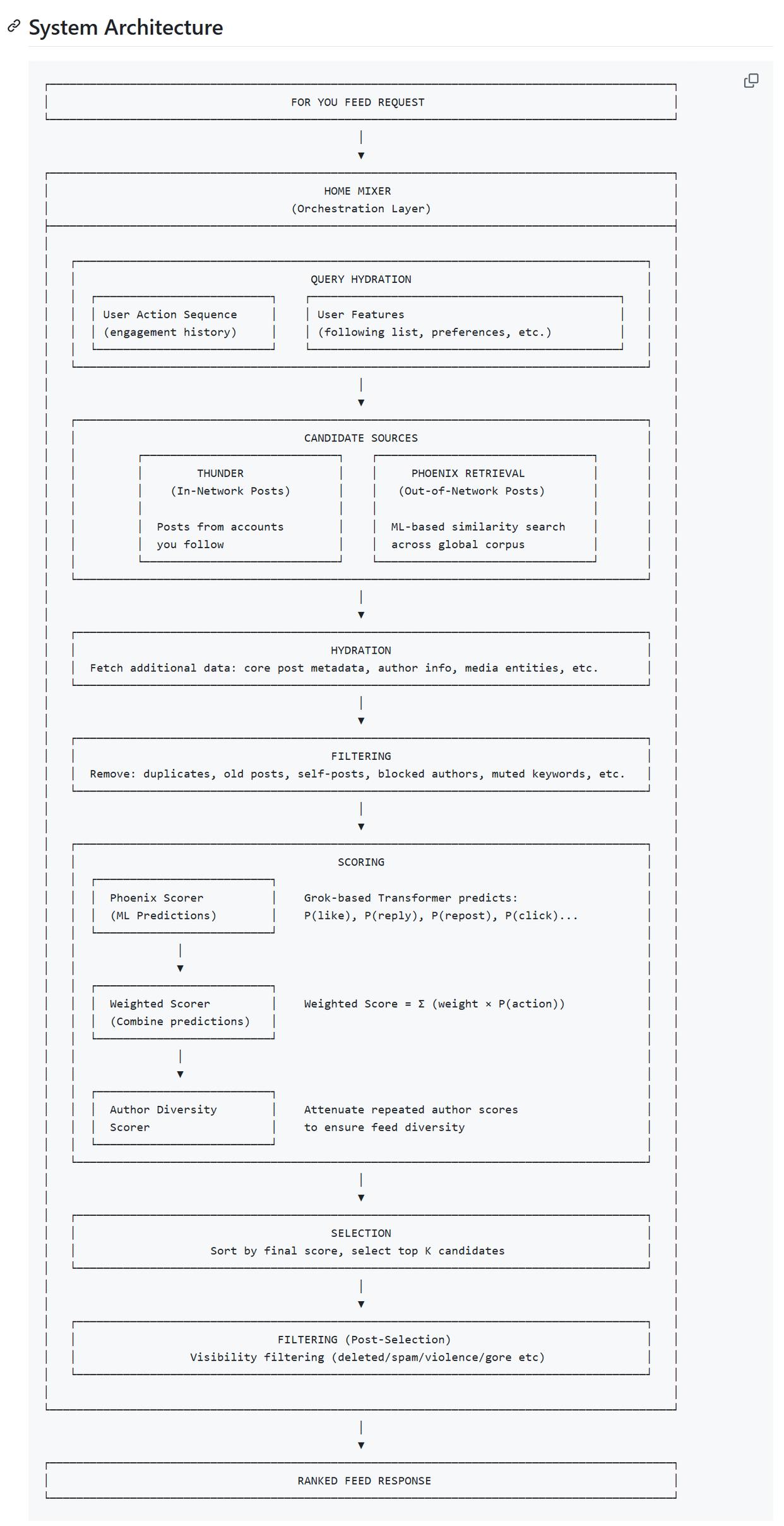 X平台在Github上介绍称,平台的“为你推荐”信息流将网络内内容(你关注的账号)以及网络外内容(通过基于机器学习的检索发现)相结合,并使用基于Grok的transformer模型对所有内容进行筛选、排序。