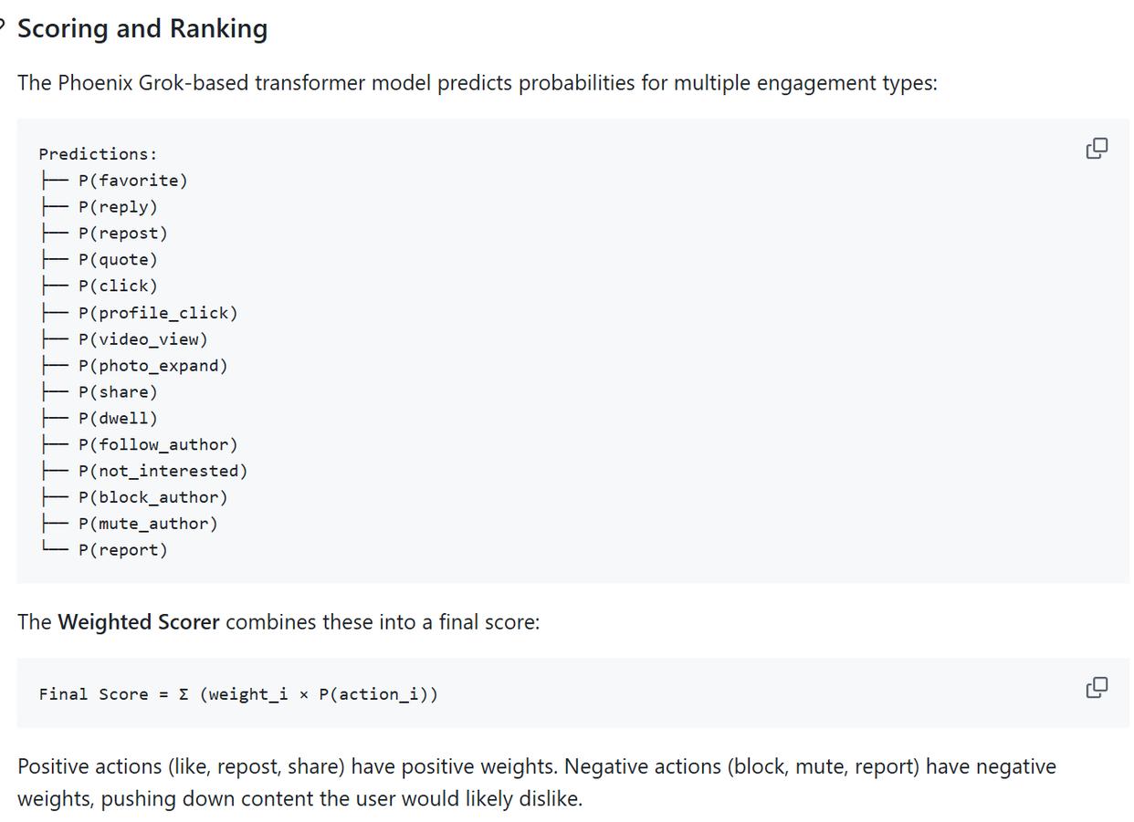 2、打分的规则完全基于用户过往行为:AI会关注用户是否更有可能点击/回复/点赞/评论/转发这条内容,同时将可能引起用户反感/拉黑/举报的内容压到后面;