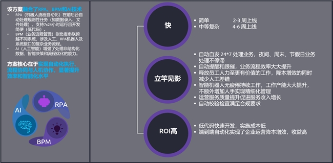 该方案基于 Mendix 实现了 BPM 的业务流程全面贯通,通过 Mendix BPM 与 RPA 和 AI 的融合,已经为客户在营销、财务、人力资源、客服等多个领域实施了高 ROI 的端到端业务流程自动化。