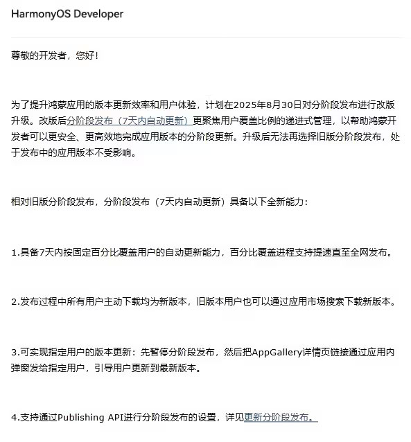 尊敬的开发者,您好!为了提升鸿蒙应用的版本更新效率和用户体验,计划在 2025 年 8 月 30 日对分阶段发布进行改版升级。改版后分阶段发布(7 天内自动更新)更聚焦用户覆盖比例的递进式管理,以帮助鸿蒙开发者可以更安全、更高效地完成应用版本的分阶段更新。升级后无法再选择旧版分阶段发布,处于发布中的应用版本不受影响。相对旧版分阶段发布,分阶段发布(7 天内自动更新)具备以下全新能力:具备 7 天内按固定百分比覆盖用户的自动更新能力,百分比覆盖进程支持提速直至全网发布。发布过程中所有用户主动下载均为新版本,旧版本用户也可以通过应用市场搜索下载新版本。可实现指定用户的版本更新:先暂停分阶段发布,然后把 AppGallery 详情页链接通过应用内弹窗发给指定用户,引导用户更新到最新版本。支持通过 Publishing API 进行分阶段发布的设置,详见更新分阶段发布。感谢您的配合与支持!