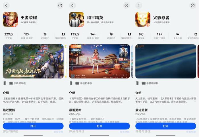 游戏领域:王者荣耀、和平精英、火影忍者三款腾讯系TOP游戏的鸿蒙版均已上架,游戏玩家能享受更流畅的对战体验,还有欢乐斗地主、欢乐麻将、天天象棋等棋牌游戏,随时随地都能来上一局,和队友并肩作战。