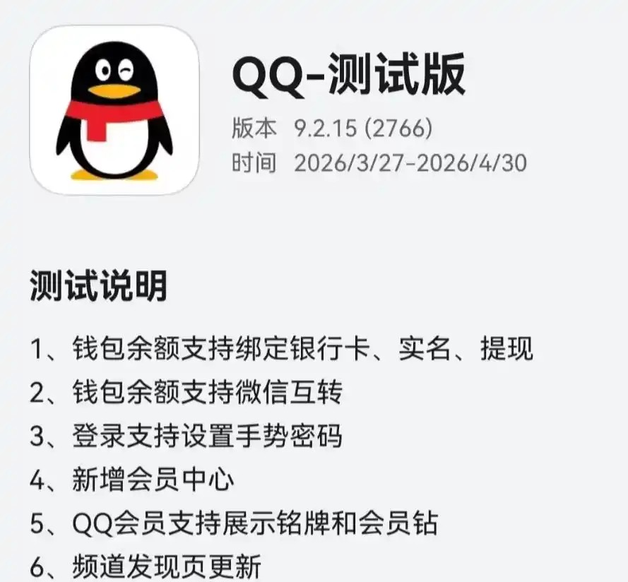 据官方介绍,本次测邀版本新增多项实用功能。支付方面,QQ钱包余额全面支持绑定银行卡、实名认证与提现操作,同时实现与微信零钱的互转功能,满足日常资金流转需求。安全与体验层面,登录环节新增手势密码设置选项,提升账号使用安全性;同时新增会员中心,QQ会员可展示专属铭牌与会员钻,优化会员用户视觉体验;频道发现页也同步完成更新。