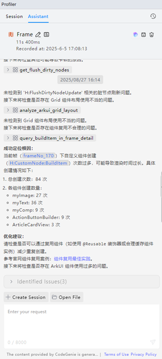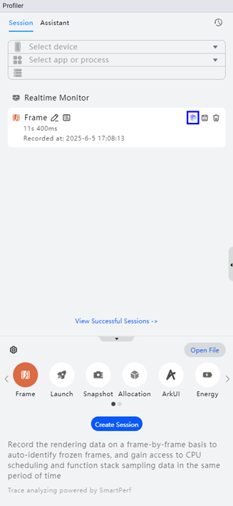 智慧调优当前支持引导录制新调优任务和直接分析已有调优数据文件两种开启方式,开发者可通过点击Create Session录制新调优任务或点击CodeGenie图标/Open File直接分析已有调优数据文件:
