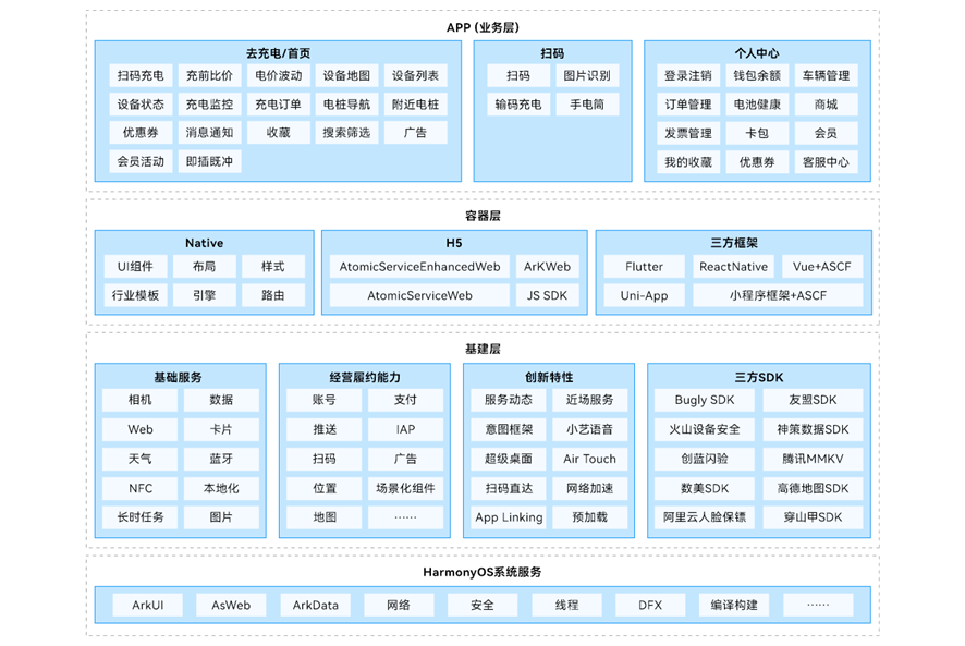解决方案采用分层架构设计,涵盖产品定制层、基础特性层与公共能力层,支持自助开发全流程。无论是快速搭建基础充电功能,还是定制化开发会员体系、电价波动、发票管理等复杂模块,都能通过模块化组件灵活组合实现。同时兼容 H5、元服务等多种形态,适配手机、车机等全场景终端。