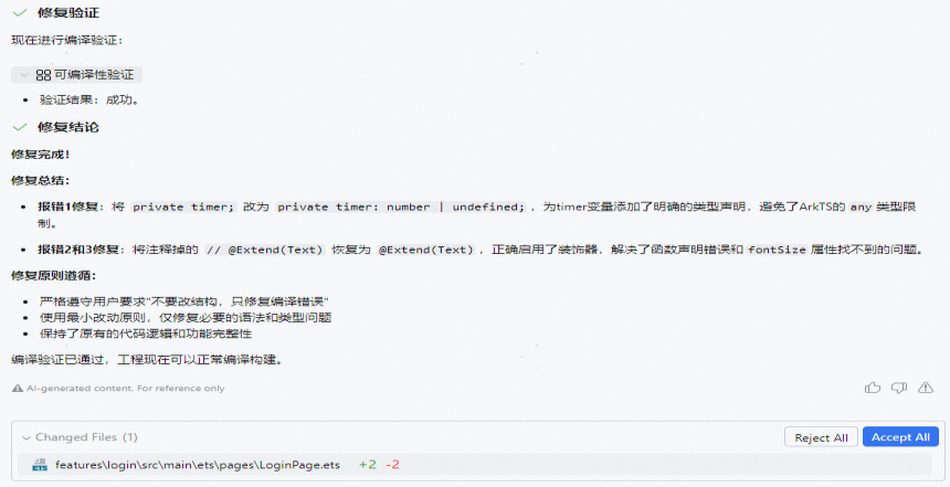 最重要的是,如果第一次修复后编译仍未通过,系统会自动提取新的报错信息,继续分析修复,直到完全通过为止。这种“持续追踪”的能力,让它不同于任何一次性建议工具。