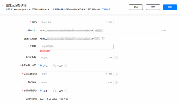1、创建元服务链接时可正常在AGC控制台进行配置,若不关联二维码,可直接使用元服务链接进行测试。