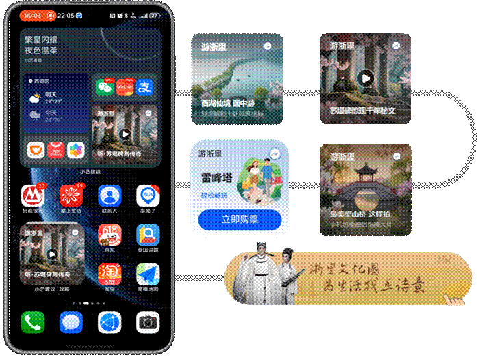 近场服务基于POI位置推荐可在游客靠近景区附近时通过小艺建议获取购票服务卡片推荐,一键直达购票页面,比传统线上购票软件减少约50%操作步骤。进入景区游览时,游客也可以基于景区内不同景点的POI点位推荐一键跳转至景区元服务详情页,当前景点讲解、后续景点推荐、游览路线推荐等一目了然,告别盲目寻找和人工问询。