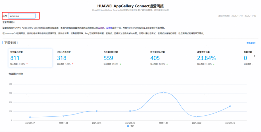 - 多维度数据摘要展示:运营周报聚焦核心业务指标,涵盖下载安装、用户分析、安装失败等关键数据。帮助开发者快速了解应用核心指标变化趋势,便于及时调整运营策略和产品优化方向,提升运营效率。