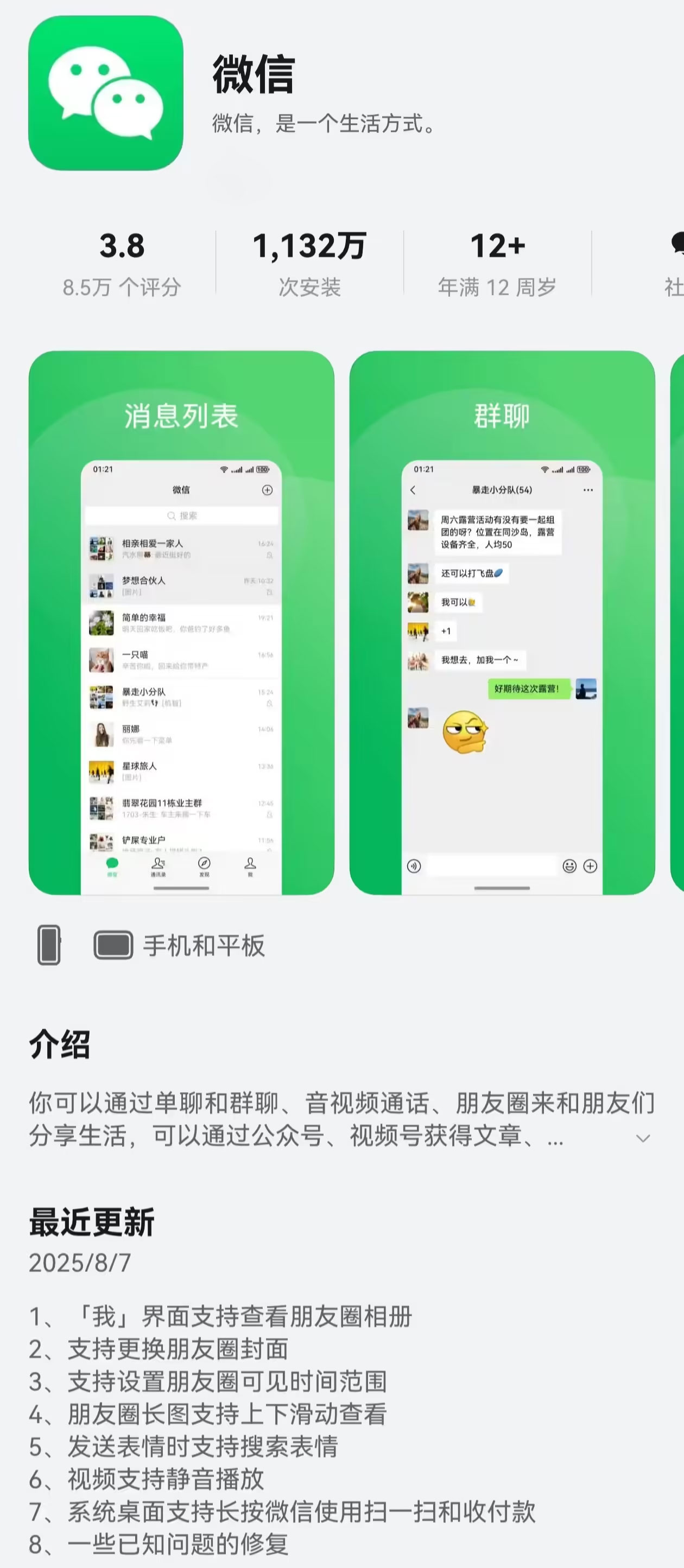 「我」界面支持查看朋友圈相册支持更换朋友圈封面支持设置朋友圈可见时间范围朋友圈长图支持上下滑动查看发送表情时支持搜索表情视频支持静音播放系统桌面支持长按微信使用扫一扫和收付款一些已知问题的修复