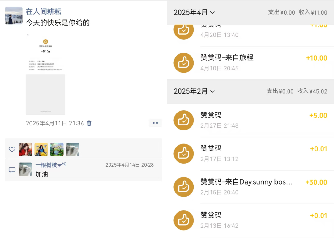 他截下那条打赏记录发在朋友圈:“今天的快乐是你给的”。