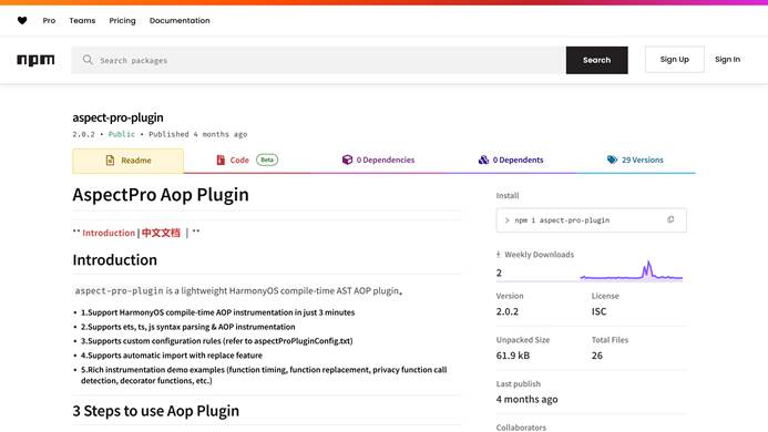 更多关于AspectPro Aop Plugin的信息,可点击以下官方链接: https://www.npmjs.com/package/aspect-pro-plugin https://developer.huawei.com/consumer/cn/blog/topic/03185822947412015