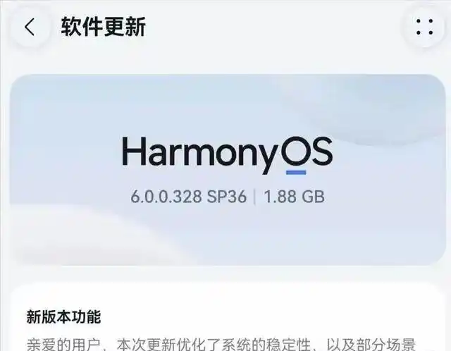 Linux中年人 2026-03-20 14:59:30 发布最近不少华为用户都收到了一个超大更新提示——鸿蒙6最新SP36版本,安装包足足1.88GB。从Mate 80、Pura 80到Mate 60、Nova系列,几乎全机型覆盖,很多人看到这么大的包都有点犹豫,毕竟现在系统更新翻车的例子太多,怕越更越卡、越更越烫。