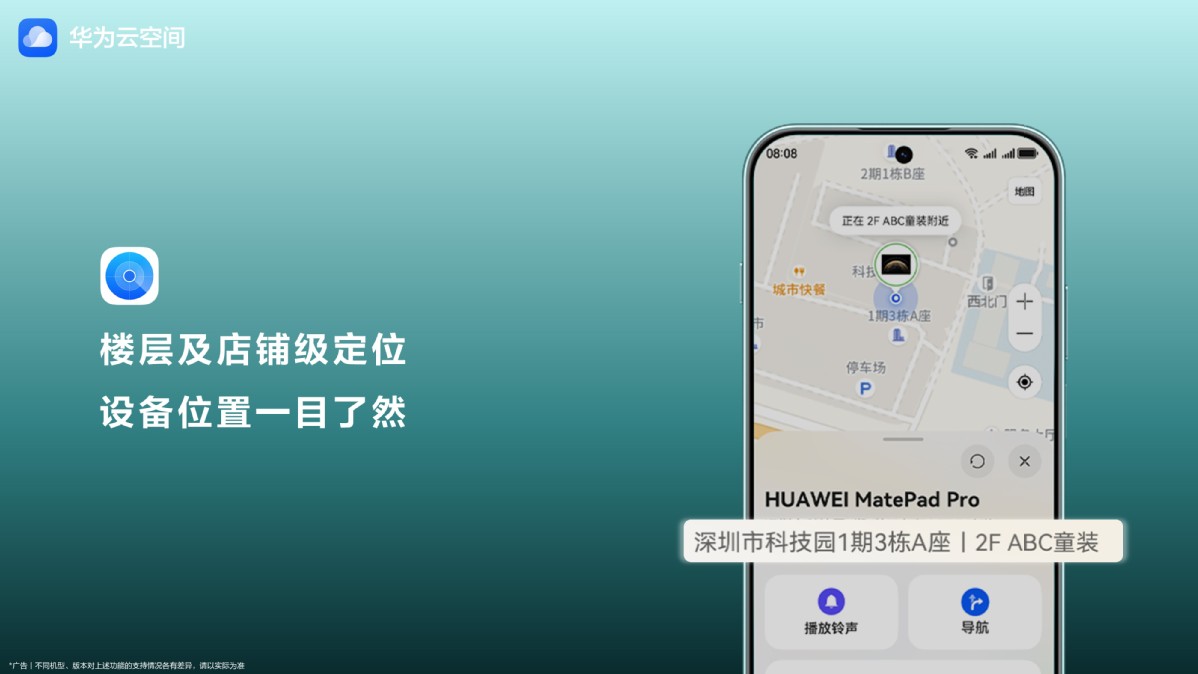 得益于室内精准定位能力提升,华为云空间的“查找设备”功能为用户带来了更坚实的设备安全守护。当设备遗失时,用户只需要打开“查找设备”App,地图上不仅会显示设备的具体地理位置,还能实时显示设备所在楼层及附近店铺的名称。目前,该功能已覆盖全国超1万个商圈、机场、车站等人流密集区域,有效解决了室内跨楼层定位模糊的难题,让设备位置一目了然。