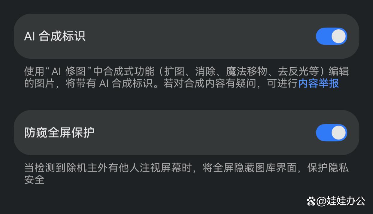 - 在图库设置页中找到防窥全屏保护并开启该功能。