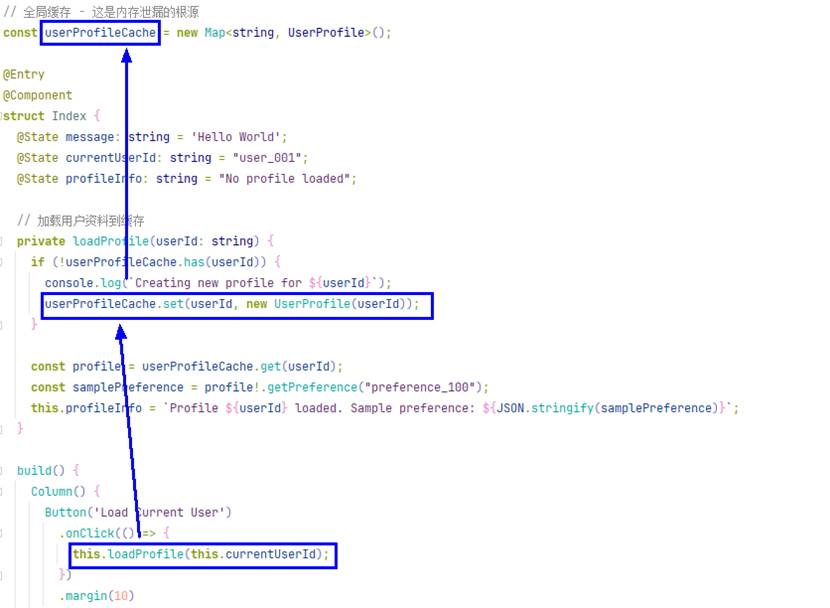在应用开发中,开发者经常依赖GC自动管理内存,忘记释放全局对象中存在的无用缓存,导致内存持续上涨,以下是一个常见代码示例: