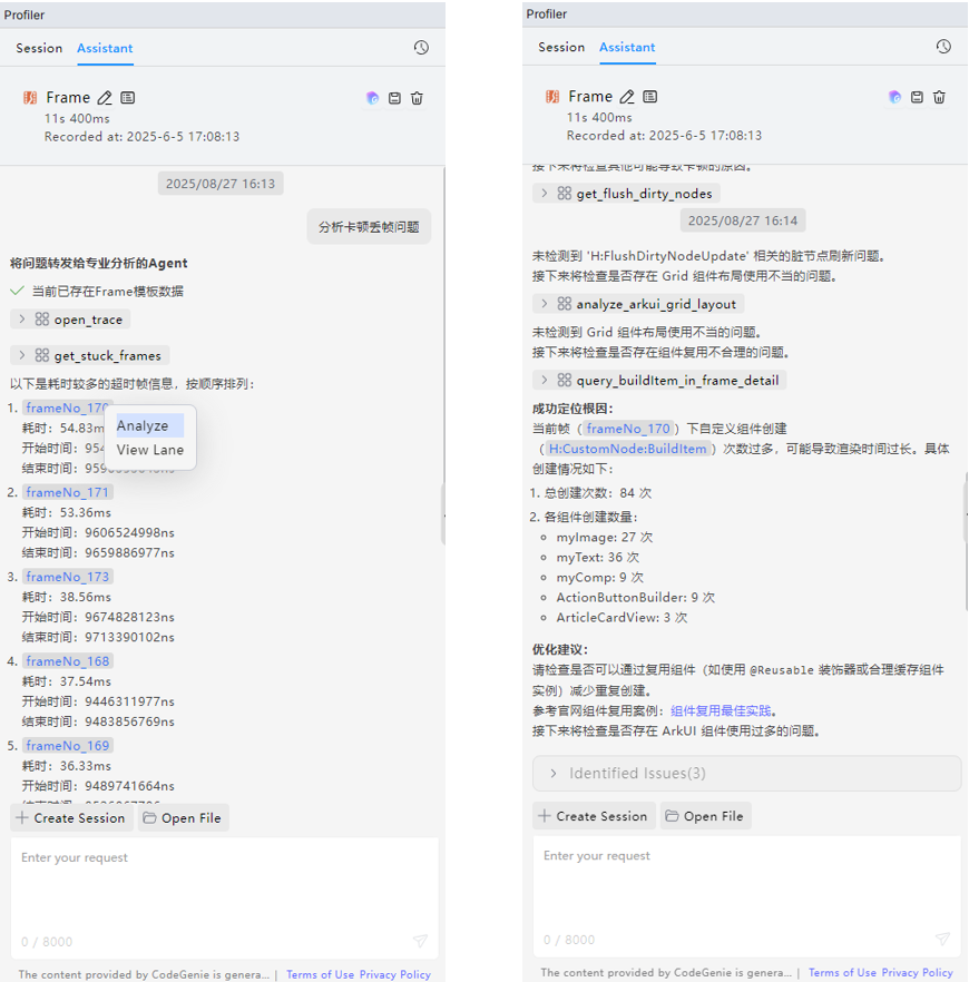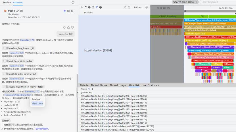 开启分析任务后,AI会分阶段进行性能问题定位与分析。以卡顿丢帧场景为例, AI首先会进行超时帧定位,定位完成后,选中超时帧,点击Analyze,深入挖掘当前帧具体问题场景,找到影响性能的可能原因。