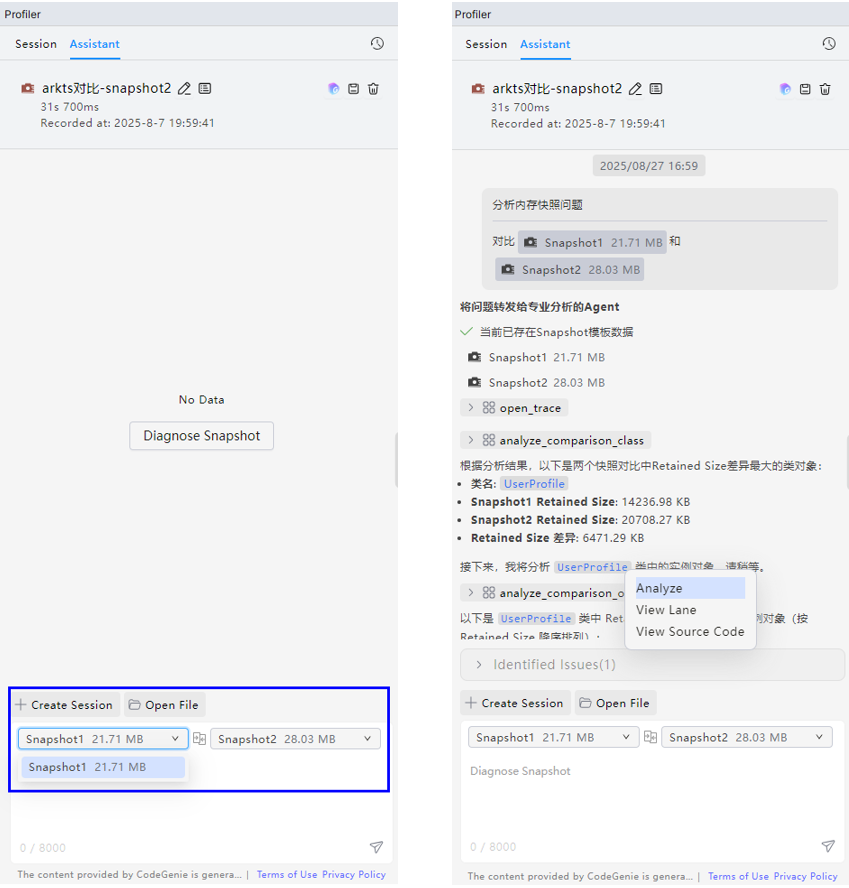 智慧调优内存分析整体使用流程和冷启动/卡顿丢帧较为相似,主要区别在于若使用Snapshot模板对堆快照问题进行分析时,支持在对话框中选择单个Snapshot分析,或选择两个Snapshot进行对比分析。开启分析任务后,AI会按类聚合,返回内存占用靠前的类信息,此时选中某个类点击Analyze