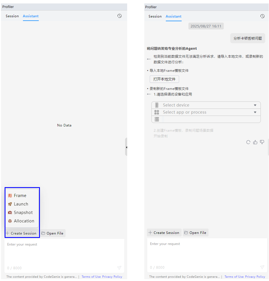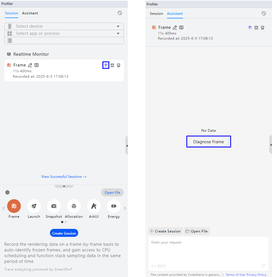 智慧调优当前支持引导录制新调优任务和直接分析已有调优数据文件两种开启方式,开发者可通过点击Create Session录制新调优任务或点击CodeGenie图标/Open File直接分析已有调优数据文件: