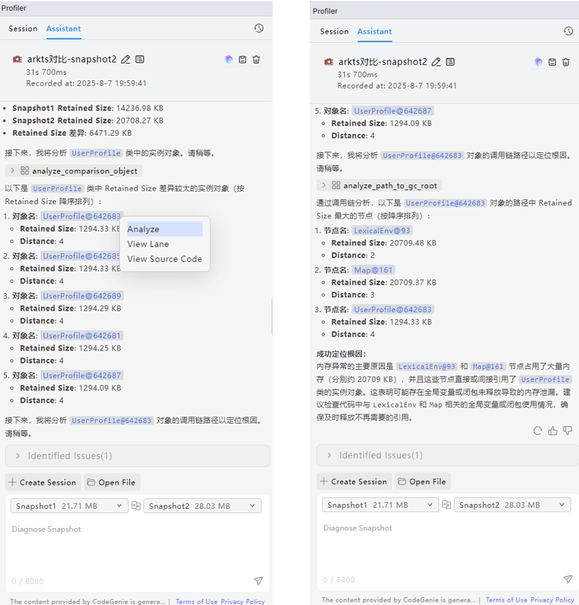 AI会列出某类较大的实例对象及各自大小,继续选中某个实例对象进行分析,AI会给出某实例对象的完整引用链(到GC Root),并给出问题疑似原因。