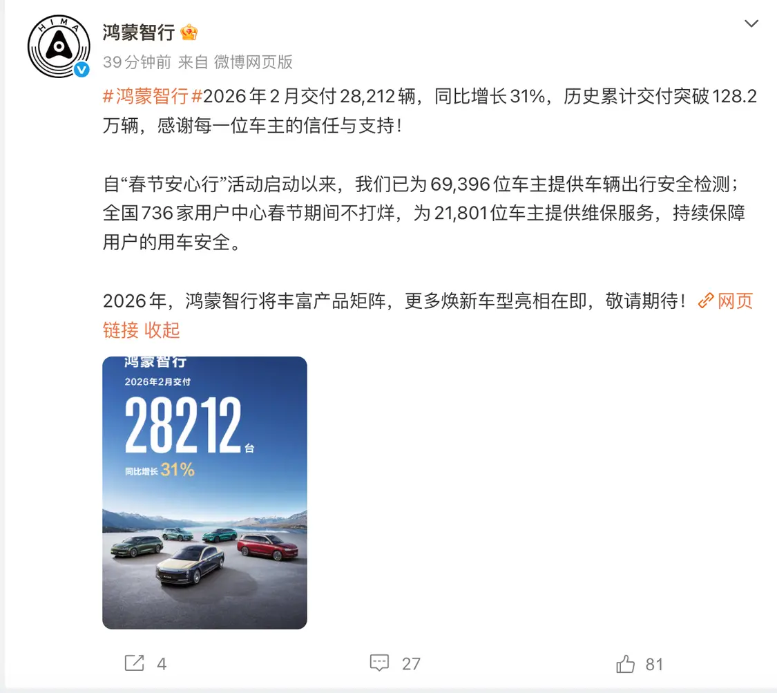 鸿蒙智行宣布:2026年2交付28212辆,同比增长31%,历史累计交付突破128.2万辆。