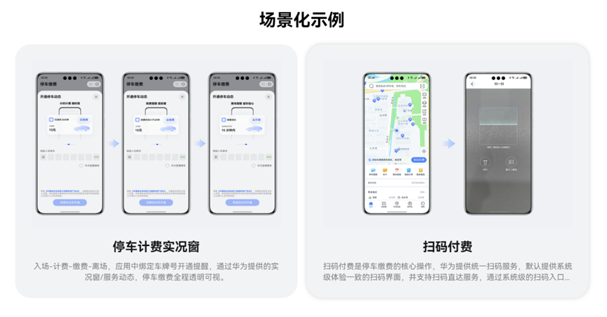 借助华为地图服务与位置服务,方案能精准推送周边停车场余位信息,支持按距离、价格、优惠等条件筛选,还可提前预约车位,让车主出行更有规划。缴费环节更是实现 “无感升级”,华为统一扫码服务支持系统级扫码直达,无需打开应用即可完成支付,鸿蒙车机版本更能实现车内 “刷脸” 免密缴费,配合停车计费实况窗,入场、计费、缴费、离场全程透明可视,15 分钟免费离场时间进一步提升通行效率。