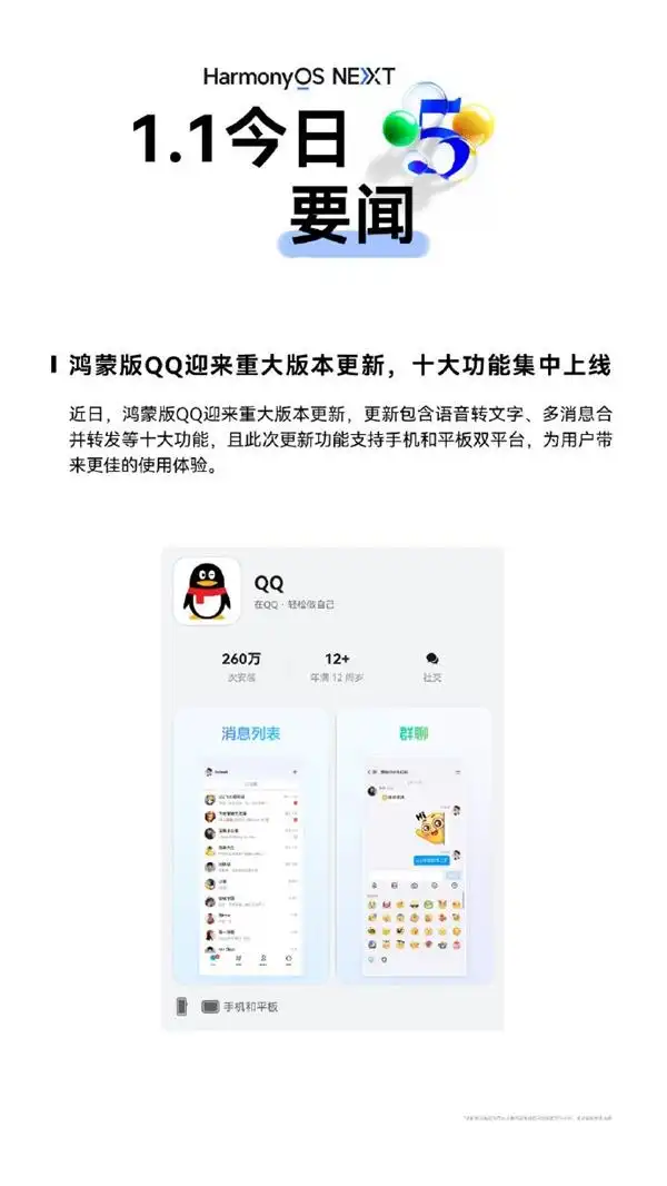 鸿蒙版QQ重磅更新,十大功能全新上线!语音转文字、多消息合并转发等实用升级,鸿蒙生态加速迈向10万应用目标,开启智慧互联新体验。
