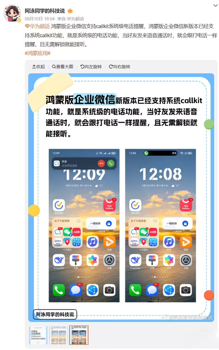 8 月 11 日消息,博主 @阿泳同学的科技说 昨天在微博透露,企业微信 0.9.8 版现已适配鸿蒙系统的 Call Kit 功能。
