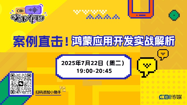 7 月 22 日,《CBI 技术有聊》鸿蒙专题直播第二期重磅开聊!《CBI 技术有聊》(CBI TALK)是 CBI 传媒为 IT 技术开发者量身打造的在线深度技术分享的视频栏目,致力于聚焦于创新开发技术、开发者生态、研发未来趋势等重要议题方向。《CBI 技术有聊》不仅是前沿 IT 技术的交流平台,也是开发者思维碰撞的实验场所。