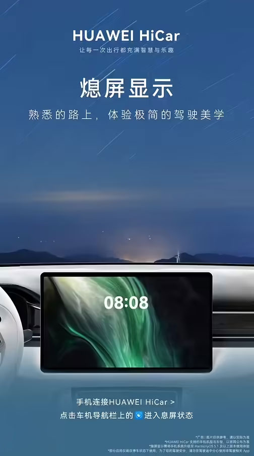 HUAWEI HiCar 熄屏显示特性当前仅华为手机鸿蒙操作系统 HarmonyOS 5.1.0.128 及以上版本支持,且需车机支持智慧桌面并满足屏幕尺寸比例限制。