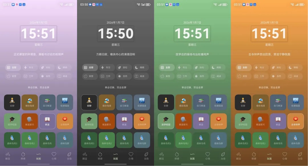 - 多维氛围场景:精选了 24 种以上的高保真环境音(如古寺钟声、旷野之风),每一款都配有专属的视觉背景。