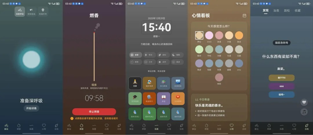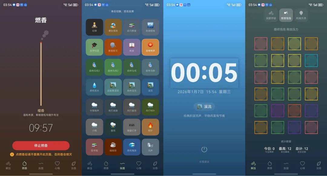- 交互式解压:利用鸿蒙优秀的线性马达调教,内置了 4-7-8 呼吸法、气泡挤压、机械开关等工具,让压力在指尖的震动中消散。