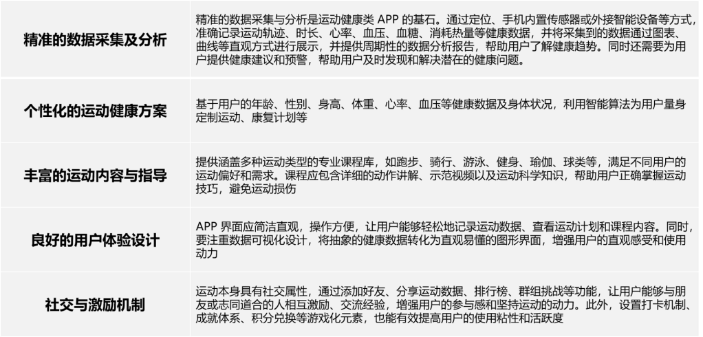 运动健康类 APP 的核心及关键在于精准的数据采集与分析、个性化的运动/健康管理方案制定、良好的用户体验设计以及社交激励机制等方面。