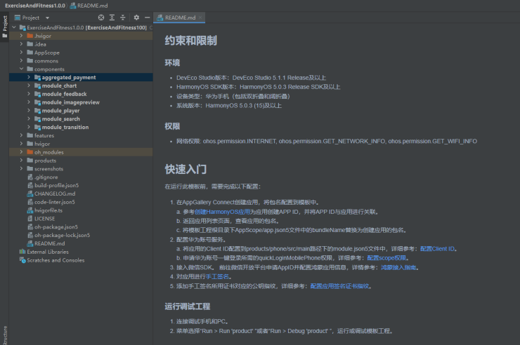 · 本模板为运动健身类应用提供了常用功能的开发样例,已集成华为账号等服务,只需做少量配置和定制即可快速实现华为账号的登录、媒体播放等功能。