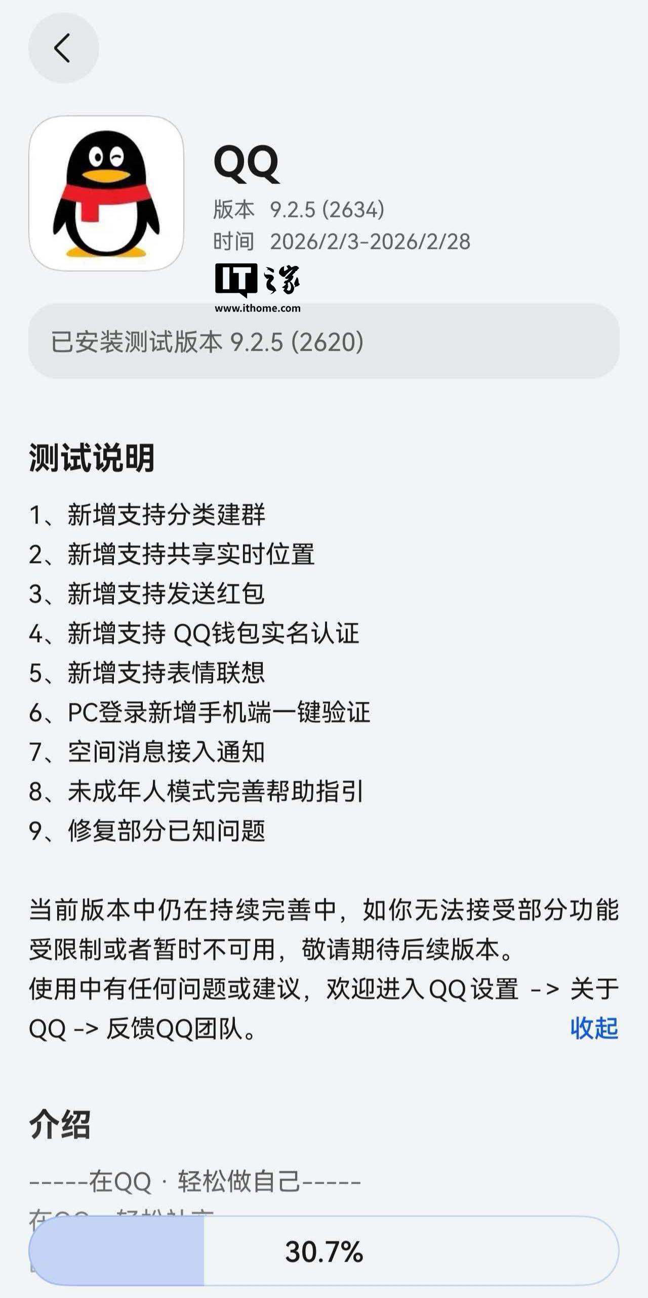 QQ 鸿蒙版 App 在华为应用市场(App Gallery)开启 9.2.5 (2634) 版本尝鲜升级(无需收到短信通知后点击链接跳转安装,可能量少,未来得及安装需等待官方“补货”),测试时间为 2026/2/3-2026/2/28。