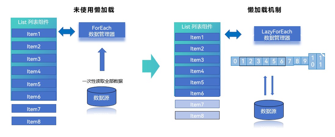 方案1:使用组件懒加载机制,减少创建数量,提升响应速度。在滚动过程中进行数据读取和加载,使用LazyForEach仅渲染可视区域项,避免一次性数据加载过多,解决页面加载耗时长问题,关于长列表优化可以参考长列表加载丢帧优化。