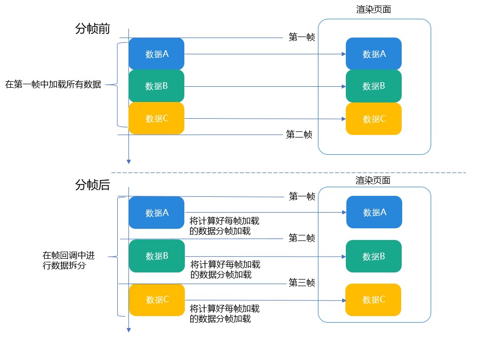 方案2:高负载场景分帧渲染,将本来一帧内加载的数据分成多帧加载,但是分帧渲染需要开发者计算每帧中加载多少数据,操作复杂,因此在必要的情况下才推荐使用。详请可点击查看。