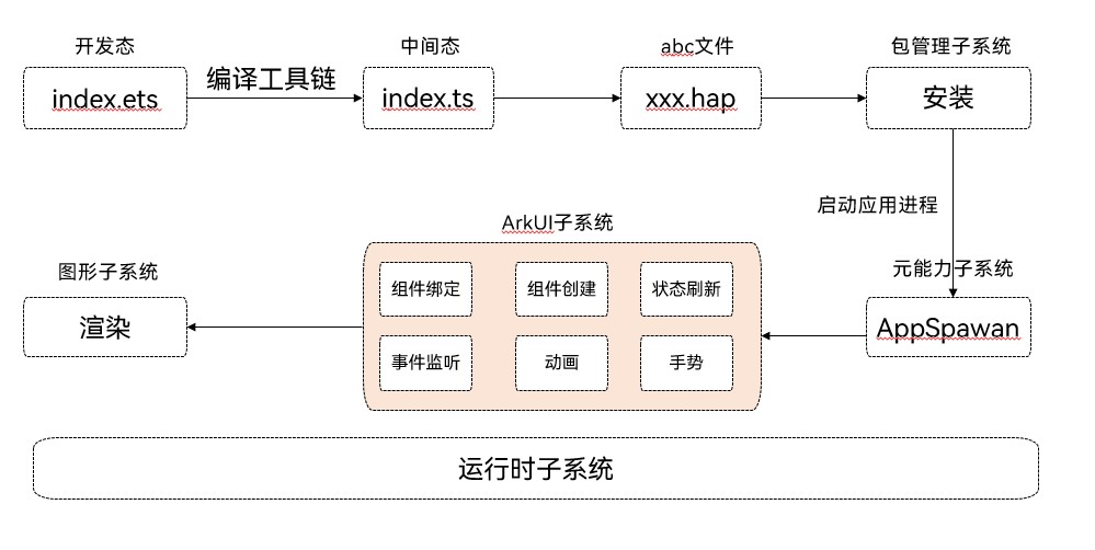 ETS源码经IDE编译生成ABC中间指令文件,打包成HAP安装包。应用启动时,原能力子系统启动对应应用进程,ArkUI子系统负责组件创建与渲染,最终由图形侧执行渲染指令,完成界面展示。
