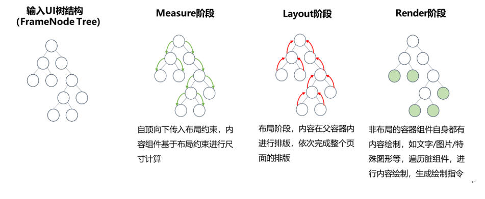 父节点传递约束条件,子节点自底向上计算尺寸和位置,完成布局测量。随后根据信息发送渲染指令,执行绘制操作,生成最终界面。