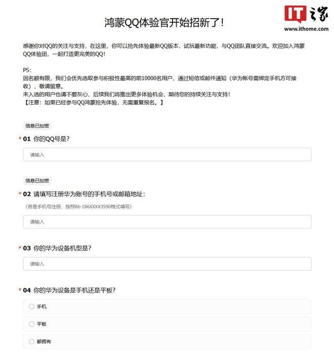 IT之家 1 月 13 日消息,据用户反馈,QQ 鸿蒙版 App 体验官招新,已开启新一轮邀测报名。据介绍,活动名额有限,会优先选取参与积极性最高的前 10000 名用户,通过短信或邮件通知(华为账号需绑定手机方可接收)。
