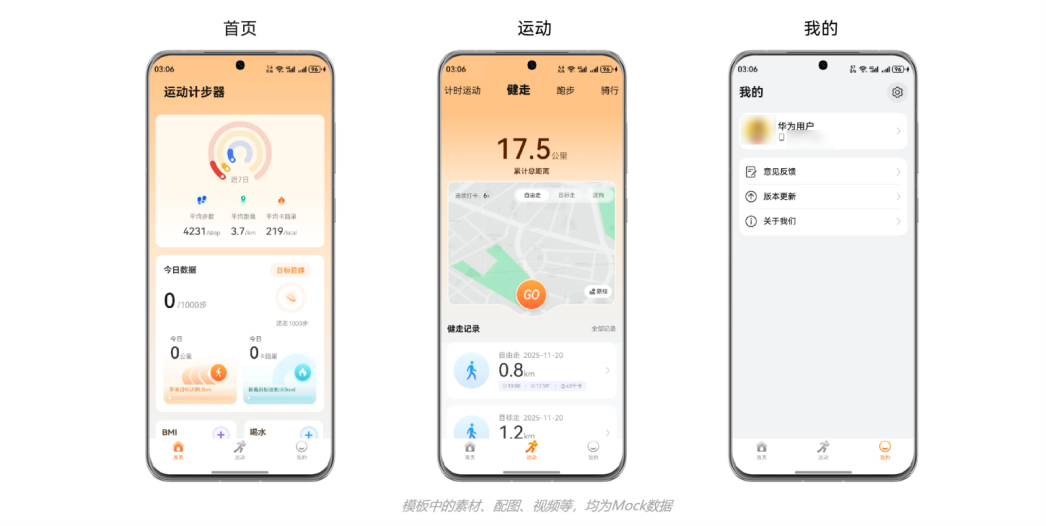 本模板为计步类应用提供了常用功能的开发样例,模板主要分首页、运动和我的三大模块,提供近七日数据、今日数据、BMI、喝水、计时运动、健走、跑步、骑行和对应记录等功能。模板已集成华为账号登录等服务,只需做少量配置和定制即可快速实现华为账号的登录等功能。
