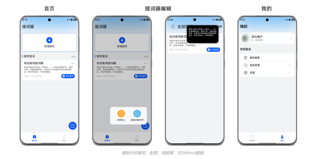 本模板为提词器类应用提供了常用功能的开发样例,模板主要分提词器和我的两大模块。提供提词文本的创建、编辑、删除、导入等功能;提词时支持选择提词板模式或者悬浮模式,以及提词内容样式的设置。模板已集成华为账号、微信登录、消息管理、应用更新检查、意见反馈等服务,只需做少量配置和定制即可快速实现提词器应用的核心功能。