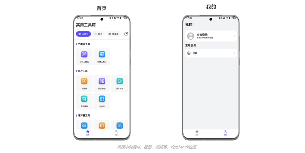 本模板为工具类应用提供了常用功能的开发样例,模板主要分首页、我的两大模块。模板已集成华为账号、微信登录等服务,只需做少量配置和定制即可快速实现华为账号的登录功能。