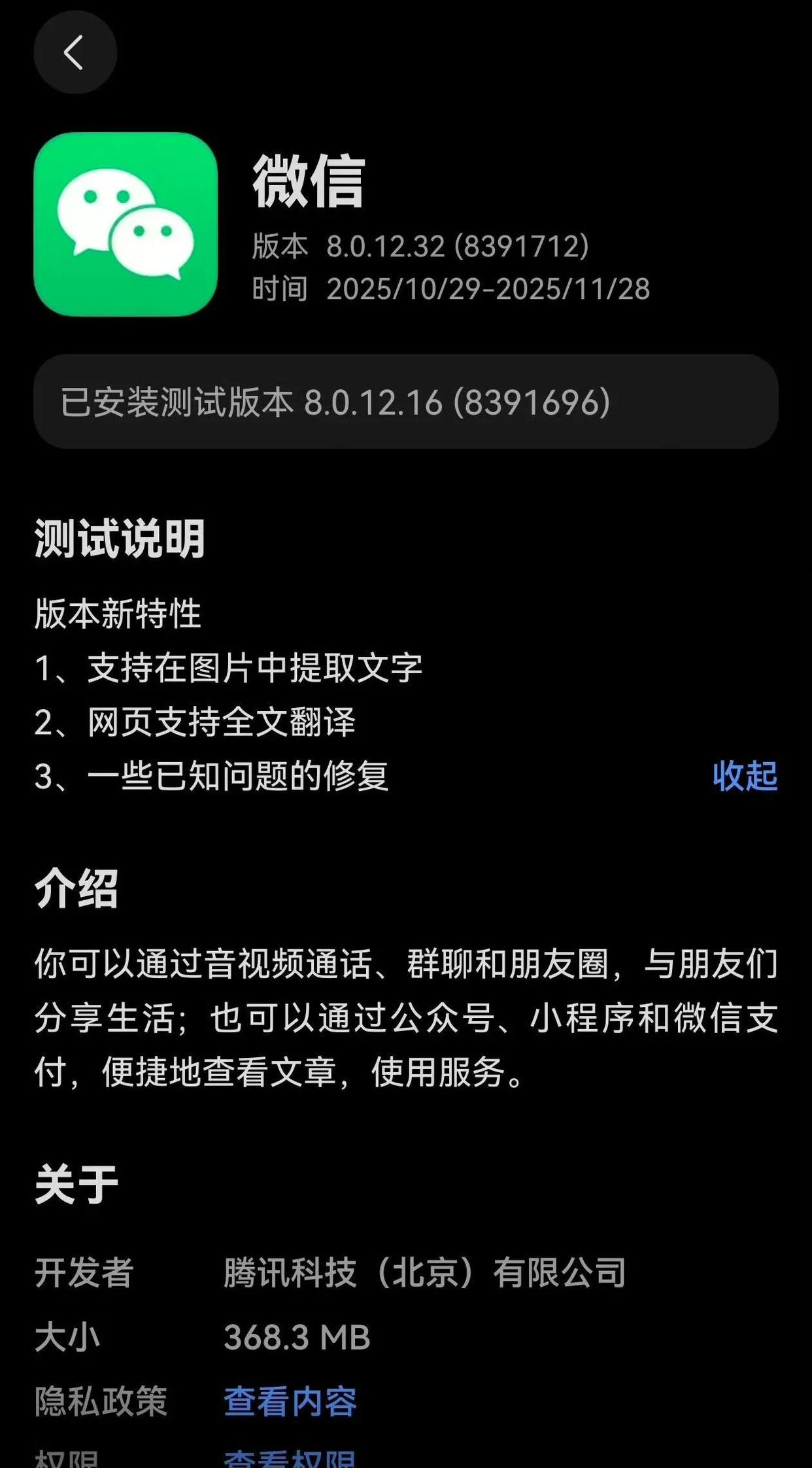 据小编了解,这次内测的8.0.12.32版本是从10月29号一直持续到11月28号。这次更新新增了两个特别实用的功能:一个是图片里的文字提取,另一个是网页全文翻译。前一个功能让你不用再手动输入图片里的文字了,后一个则能帮你轻松看懂外文网页,对上班族和学生党来说简直是效率提升的大神器!