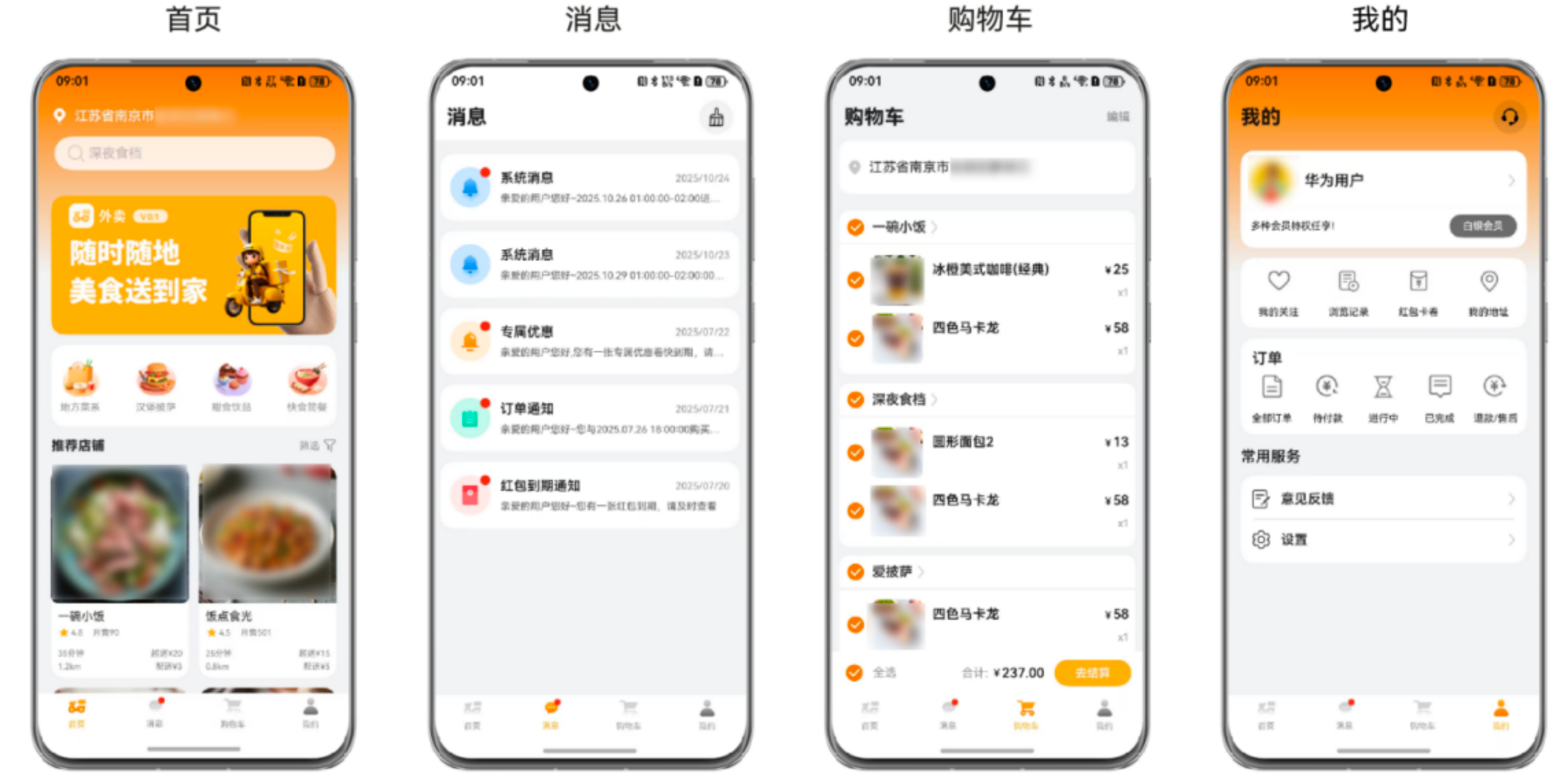 本模板为外卖类应用提供了常用功能的开发样例,模板主要分首页、消息、购物车和我的四大模块。本模板已集成华为账号、支付宝登录、微信登录等服务,只需做少量配置和定制即可快速实现华为账号的登录、外卖等功能。