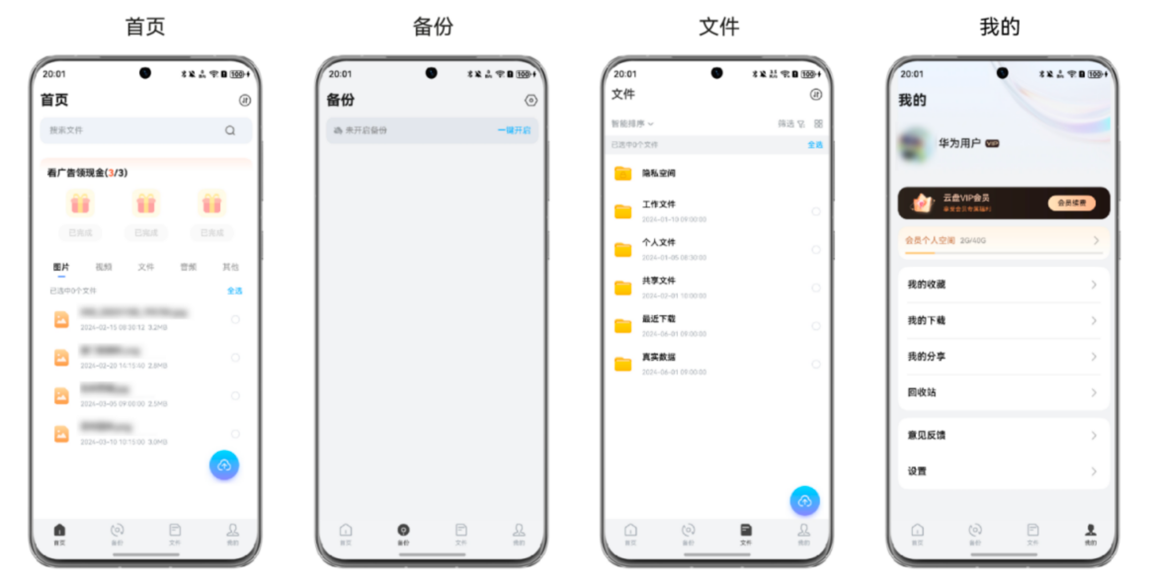 本模板为网盘类应用提供了常用功能的开发样例,模板主要分首页、备份、文件管理和个人中心四大模块。本模板已集成华为账号、云存储、推送、支付等服务,支持深色模式、适老化、无障碍等特性,提供完整的网盘应用解决方案,只需做少量配置和定制即可快速实现网盘应用的核心功能。
