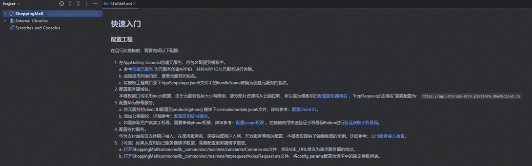 · 打开模板工程,根据README说明中的快速入门章节,将自己的应用信息配置在模板工程内,即可运行并查看模板效果。