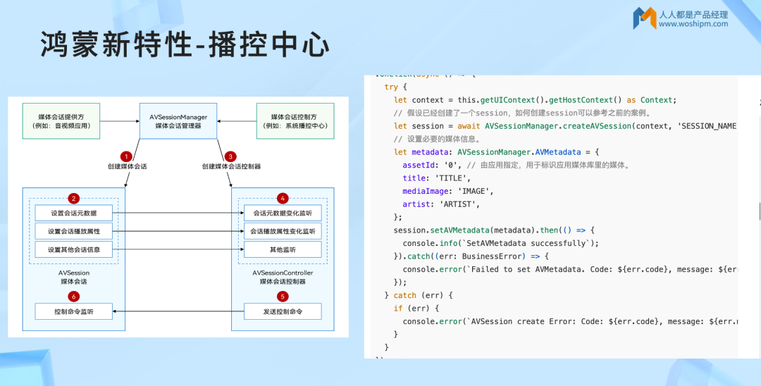 实现方式:通过AVSessionManager创建媒体会话,设置媒体信息(标题、图片、艺术家等),创建会话控制器并监听播放状态变化,实现与系统播控中心的联动。