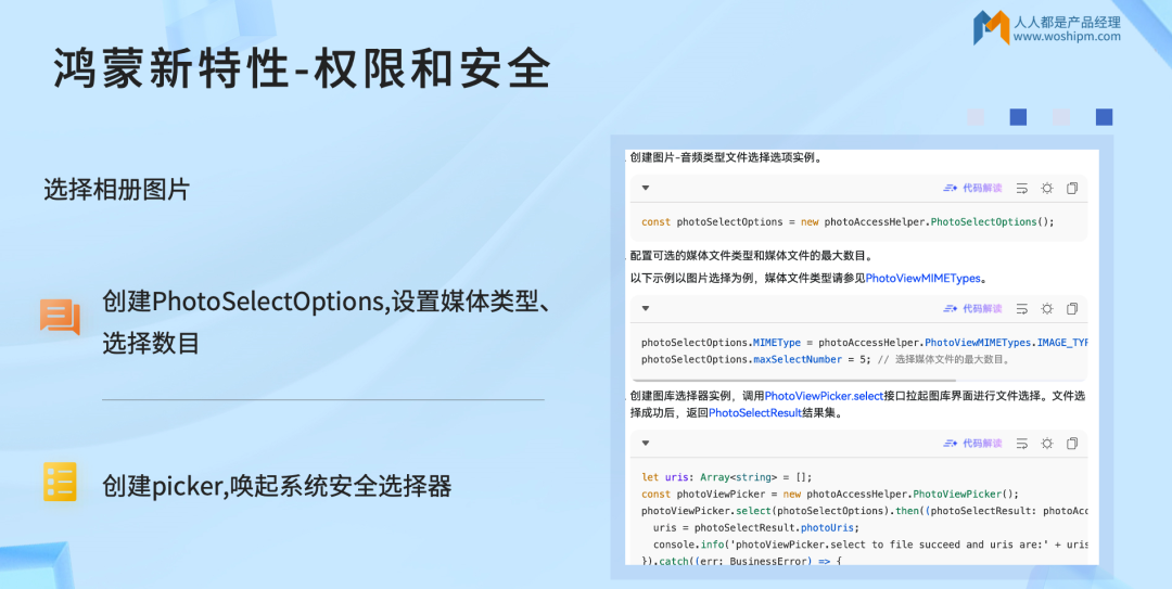 实现方式:创建PhotoSelectOptions类,配置媒体文件类型(如图片JPG/PNG)、最大选择数目,通过创建picker唤起系统安全选择器,获取用户选中图片的URIs即可。