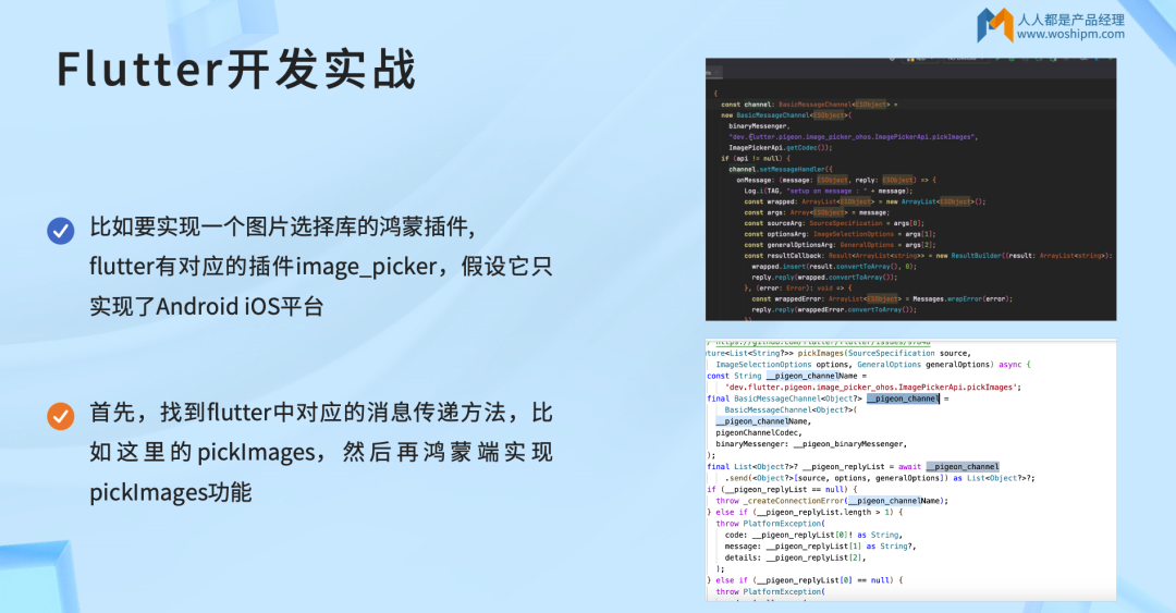 插件开发示例:若需实现图片选择库的鸿蒙适配(假设该库仅支持Android、iOS),只需找到Flutter中对应的消息传递方法(如pickImages),在鸿蒙端实现原生能力(打开相册、选择图片、回传数据),即可让Flutter应用在鸿蒙端正常使用该功能。